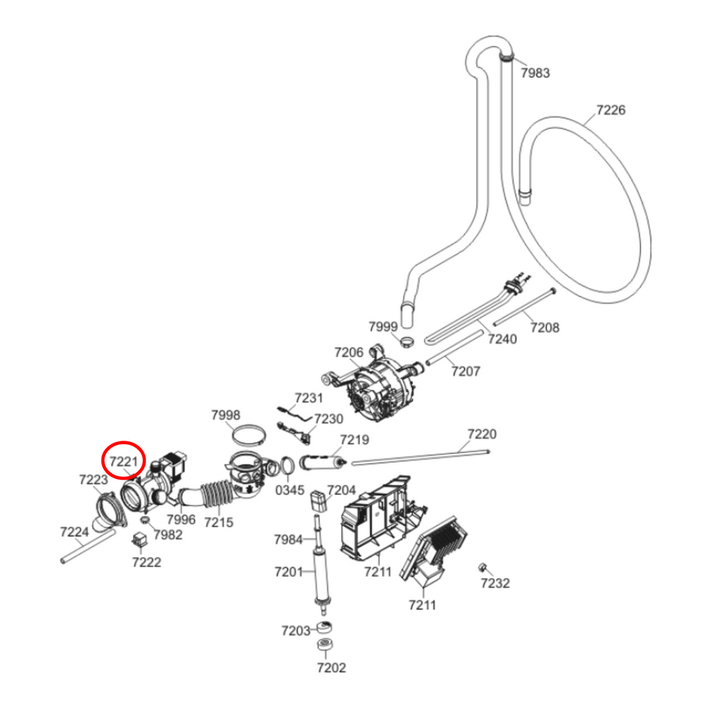Replacement filter housing with pump for Asko front-load washing machines. This part assists in draining water and filtering debris from the drum.