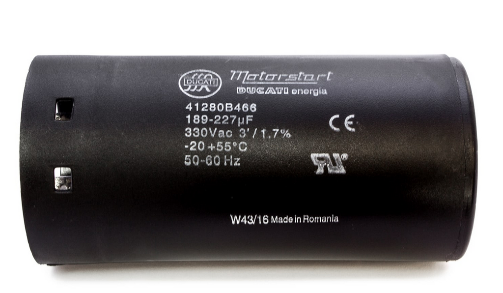 Ducati Energia Italia 189–227µF Motor Start Capacitor 41280B466 is a high-quality motor start capacitor designed for reliable starting performance in motors and electrical appliances requiring high starting torque. Manufactured by Ducati Energia, this capacitor is suitable for universal motor applications up to 330V and is commonly used in vacuum cleaners and other home appliances.